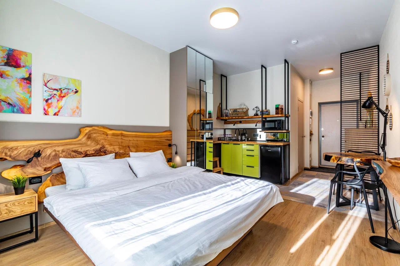 Снять квартиру посуточно в Екатеринбурге у ТРЦ Мегаполис (Отто Шмидта 44) 📍 Локация ул Отто Шмидта 44, Чкаловский район, ЖК «Апельсин». 5 минут пешком до станции метро «Чкаловская» и Южного автовокзала. 10 минут на автомобиле до исторического центра города и площади 1905 года. Прямой выезд на улицы Московская и Щорса. 🏠 Оснащение и техника Дизайнерская студия 32 м² с уникальными элементами интерьера из натурального дерева. Вместимость — 2 гостя. Интерьер: Современный ремонт, акцентная мебель из слэбов дерева (изг...