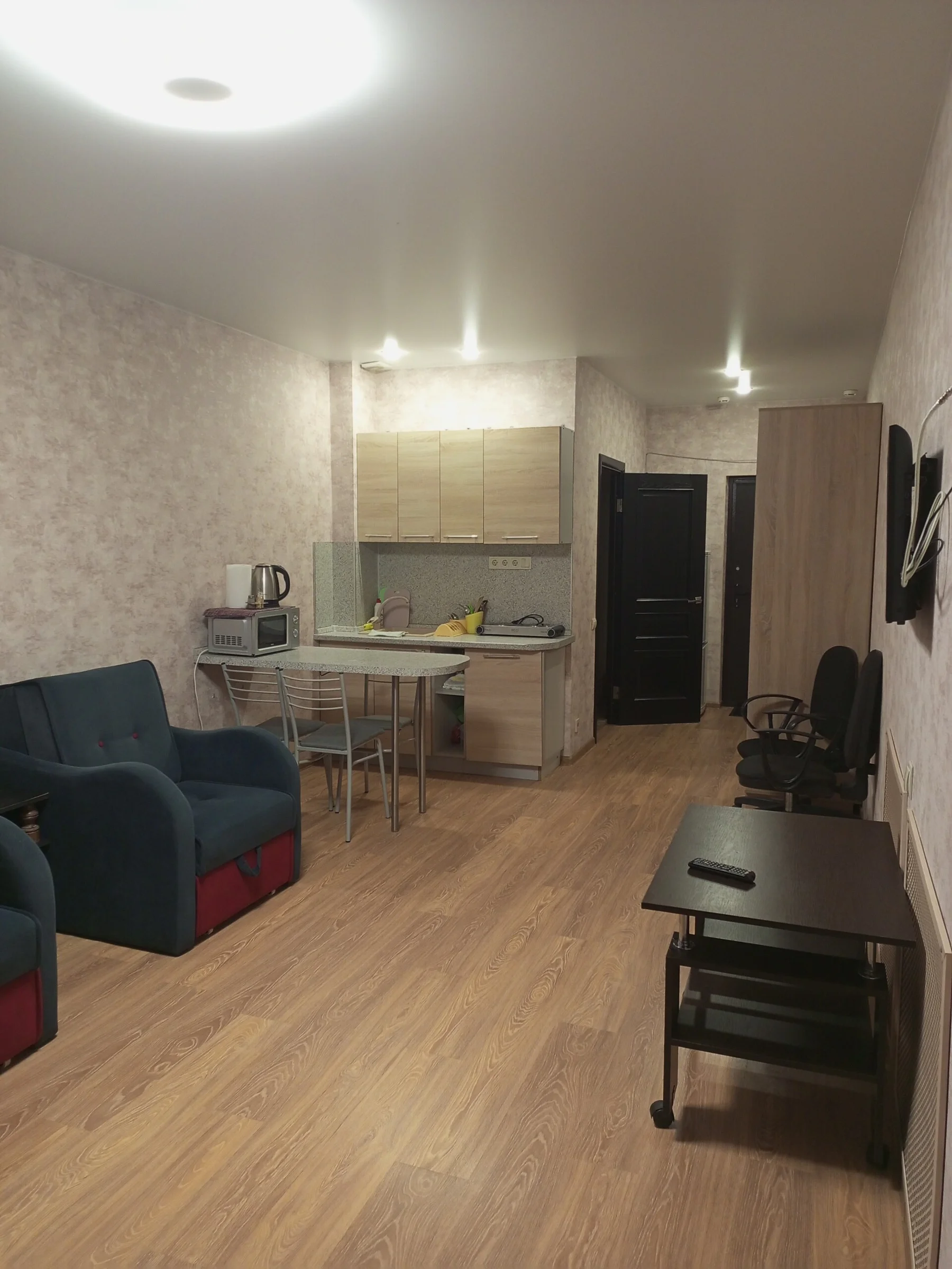 Снять посуточно студию-эконом в Сочи у моря (Гайдара 22) 📍 Локация ул Гайдара 22, микрорайон Дагомыс. 15–20 минут пешком до центрального пляжа «Дагомыс». 50 метров до пешеходного моста через реку Дагомыс. 🏠 Оснащение и техника Студия, 35 кв.м, 4 спальных места (диван + 2 кресло-кровати). Интерьер: Светло-розовые обои с цветочным принтом, ламинат «светлый дуб», натяжной потолок. Окна выходят на зеленую зону и реку. Мебель: Раскладной диван с синей обивкой и красными вставками, два аналогичных кресла-кровати, обеде...