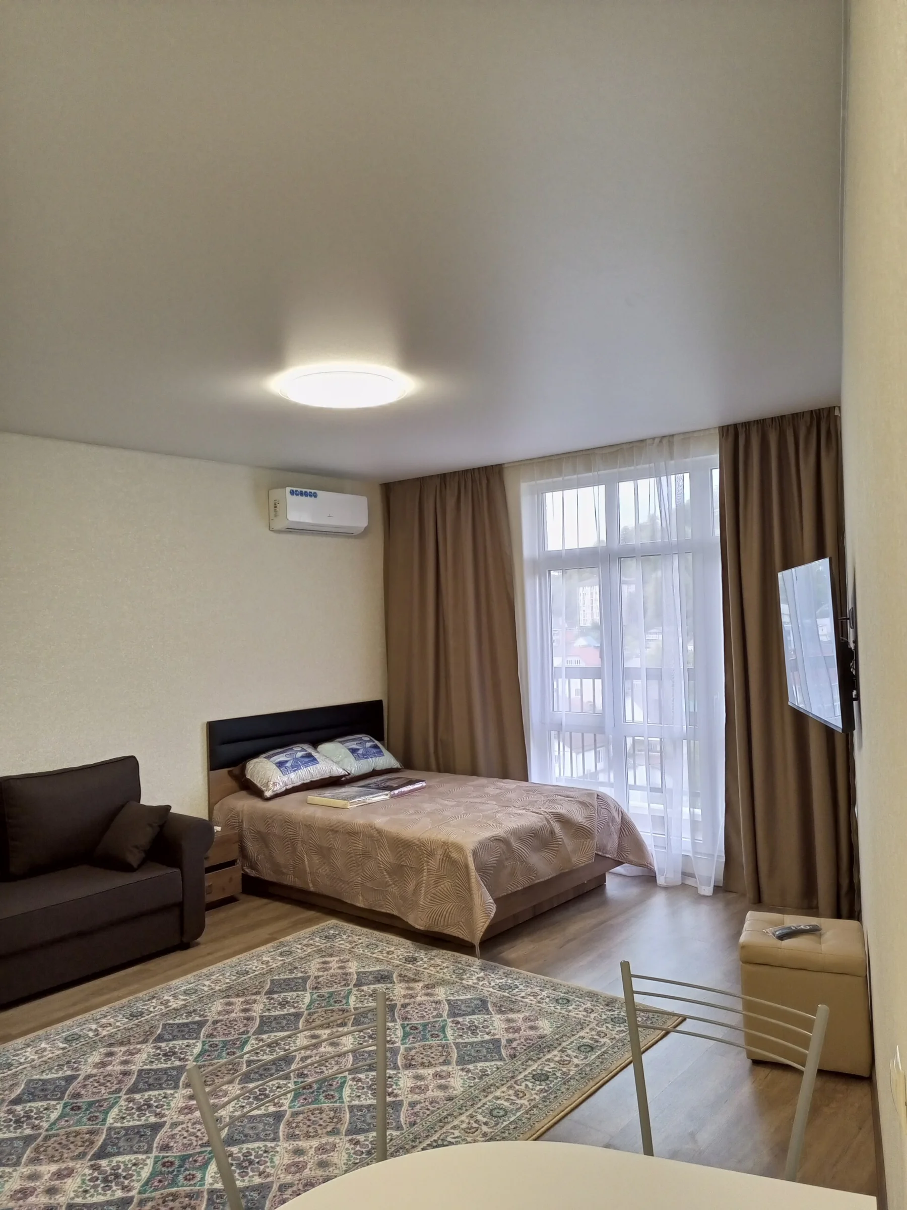 Снять посуточно студию в Сочи у моря (Гайдара 22) 📍 Локация ул Гайдара 22, микрорайон Дагомыс. 10 минут пешком до пляжа «Дагомыс» и набережной. Удобная транспортная развязка для поездок в Олимпийский парк и на Красную Поляну. 🏠 Оснащение и техника Студия, 4 спальных места (2 кровати), панорамный вид на горы и город с открытого балкона. Интерьер: Светлая цветовая гамма, натяжные потолки, ковролин с восточным узором. Плотные портьеры кофейного цвета. Мебель: Большая двуспальная кровать, раскладной коричневый диван,...
