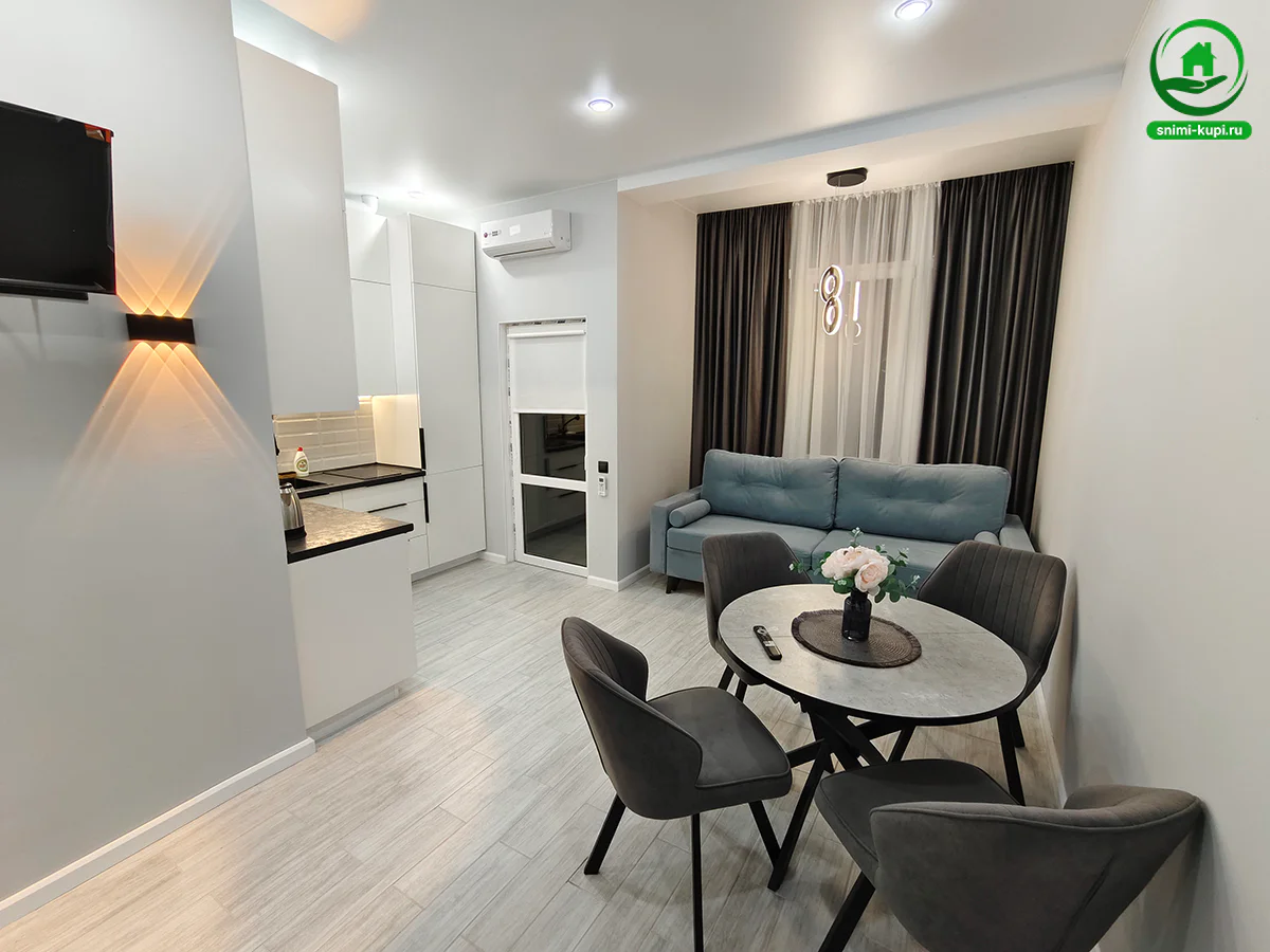 Снять посуточно студию в Севастополе у моря (Челнокова 48А) 📍 Локация ул Челнокова 48А, Гагаринский район. 10 минут пешком до пляжа «Адмиральская Лагуна» и набережной Андрея Первозванного. 5 минут на авто до ТЦ «Апельсин» и Динопарка. 🏠 Оснащение и техника Студия-комфорт, 30 кв.м, новый дом. 4 спальных места (2 кровати). Интерьер: Современный дизайнерский ремонт, светлые стены, зонированное точечное освещение. Панорамное остекление с выходом на личную террасу. Вид на море из окна. Мебель: Двуспальная кровать с ор...