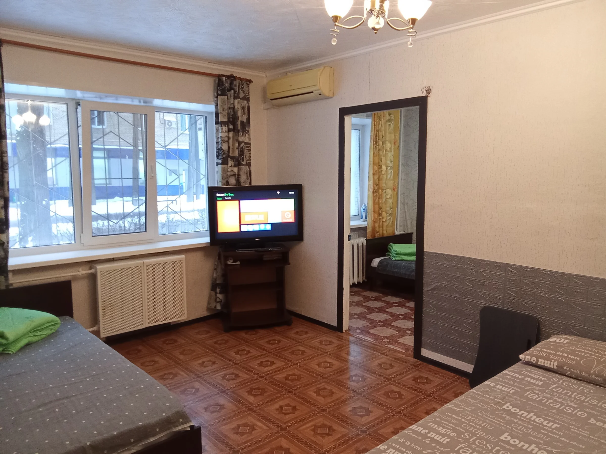 Аренда посуточно 2-к квартиры в Мытищах у театра ФЭСТ (ул. Щербакова 1) 📍 Локация ул Щербакова 1, Центральный район. 5 минут пешком до театра ФЭСТ и парка Чайленд, 15 минут до ж/д станции Тайнинская. 20 минут на транспорте до метро Медведково. 🏠 Оснащение и техника 2-комнатная квартира, 45 кв.м, 5 спальных мест (2+2+1). Интерьер: Классический ремонт, комбинированные обои (светлый верх, темный низ с узором), линолеум под дерево. Окна выходят во двор. Мебель: Двуспальная кровать с принтом на изножье, раскладной сер...