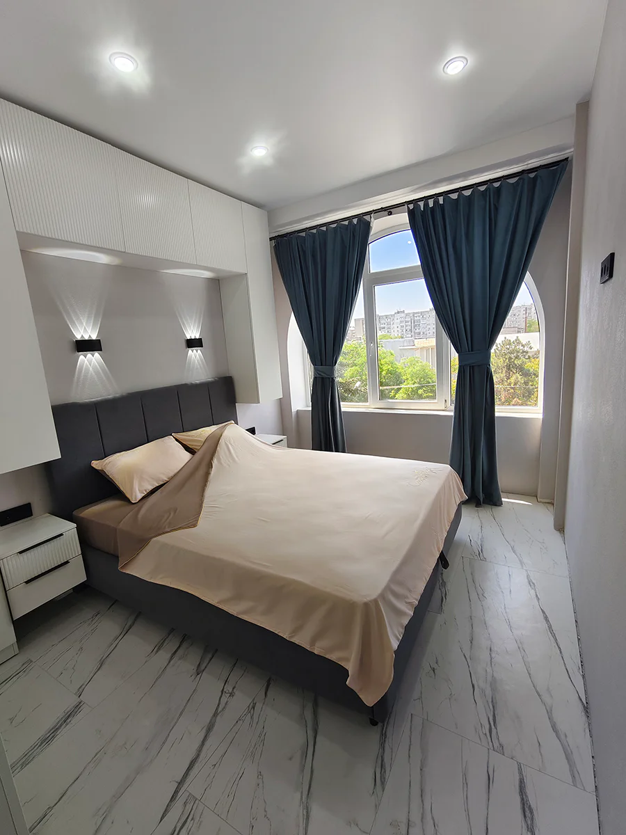 Квартира на сутки в Евпатории в центре (Фрунзе 20) 📍 Локация ул Фрунзе 20, Центральный район. 10–15 минут пешком до центральной набережной и пляжей. Рядом парки развлечений, кинотеатр и торговый центр. 🏠 Оснащение и техника Апартаменты Люкс 17, новый дизайнерский ремонт, панорамные арочные окна (южная сторона). 5 спальных мест (3 кровати). Интерьер: Пол — белый керамогранит с серыми прожилками. Стены в светло-серых тонах, декоративные реечные панели в зоне ТВ. Многоуровневое освещение с точечными светильниками и...
